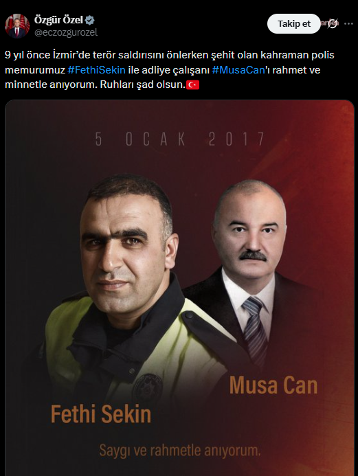 Özel, “9 yıl önce İzmir’de terör saldırısını önlerken şehit olan kahraman polis memurumuz Fethi Sekin ile adliye çalışanı Musa Can’ı rahmet ve minnetle anıyorum. Ruhları şad olsun” ifadelerini kullandı.