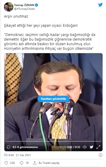 CHP İzmir Milletvekili Tuncay Özkan, "Arşiv unutmaz" notuyla Cumhurbaşkanı Recep Tayip Erdoğan'ın geçmişte yaptığı bir konuşmayı paylaştı. Söz konusu videoda Erdoğan "Demokrasi, seçimin varlığı kadar yargı bağımsızlığı da demektir" ifadelerini kullanıyor.