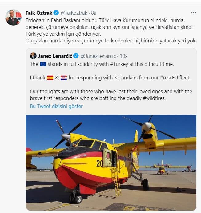 Erdoğan’ın bu sözlerine yanıt veren CHP Parti Sözcüsü Faik Öztrak, ”Erdoğan’ın Fahri Başkanı olduğu Türk Hava Kurumunun elindeki, hurda denerek, çürümeye bırakılan, uçakların aynısını İspanya ve Hırvatistan şimdi Türkiye’ye yardım İçin gönderiyor. O uçakları hurda diyerek çürümeye terk edenler, hiçbirinizin yatacak yeri yok” diyerek yaşanan duruma tepki gösterdi.