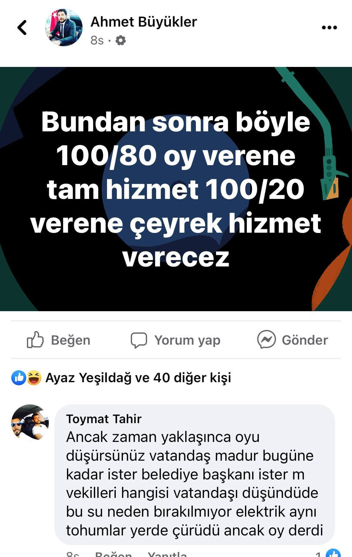 CHP İstanbul Milletvekili Mahmut Tanal, sosyal medya hesabından kamuoyuna duyurduğu Ahmet Büyükler’in  “Bundan sonra yüzde 100/80 oy verene tam hizmet, 100/20 verene çeyrek hizmet verecez” mesajını eleştirmişti.