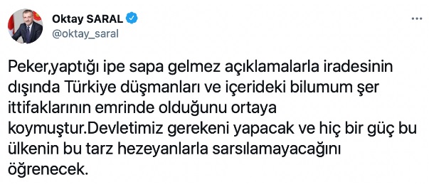 Saral, “Peker, yaptığı ipe sapa gelmez açıklamalarla iradesinin dışında Türkiye düşmanları ve içerideki bilumum şer ittifaklarının emrinde olduğunu ortaya koymuştur. Devletimiz gerekeni yapacak ve hiç bir güç bu ülkenin bu tarz hezeyanlarla sarsılamayacağını öğrenecek” ifadelerini kullandı.
