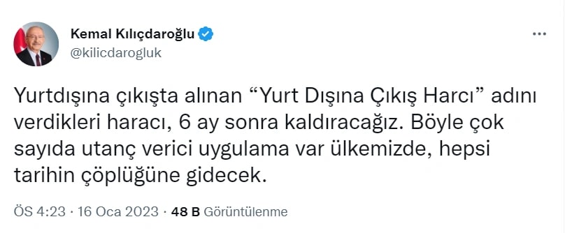 Yurtdışına çıkışta alınan harca tepki gösteren CHP Genel Başkanı Kemal Kılıçdaroğlu, “Yurtdışına çıkışta alınan ‘Yurt Dışına Çıkış Harcı’ adını verdikleri haracı, 6 ay sonra kaldıracağız” dedi.