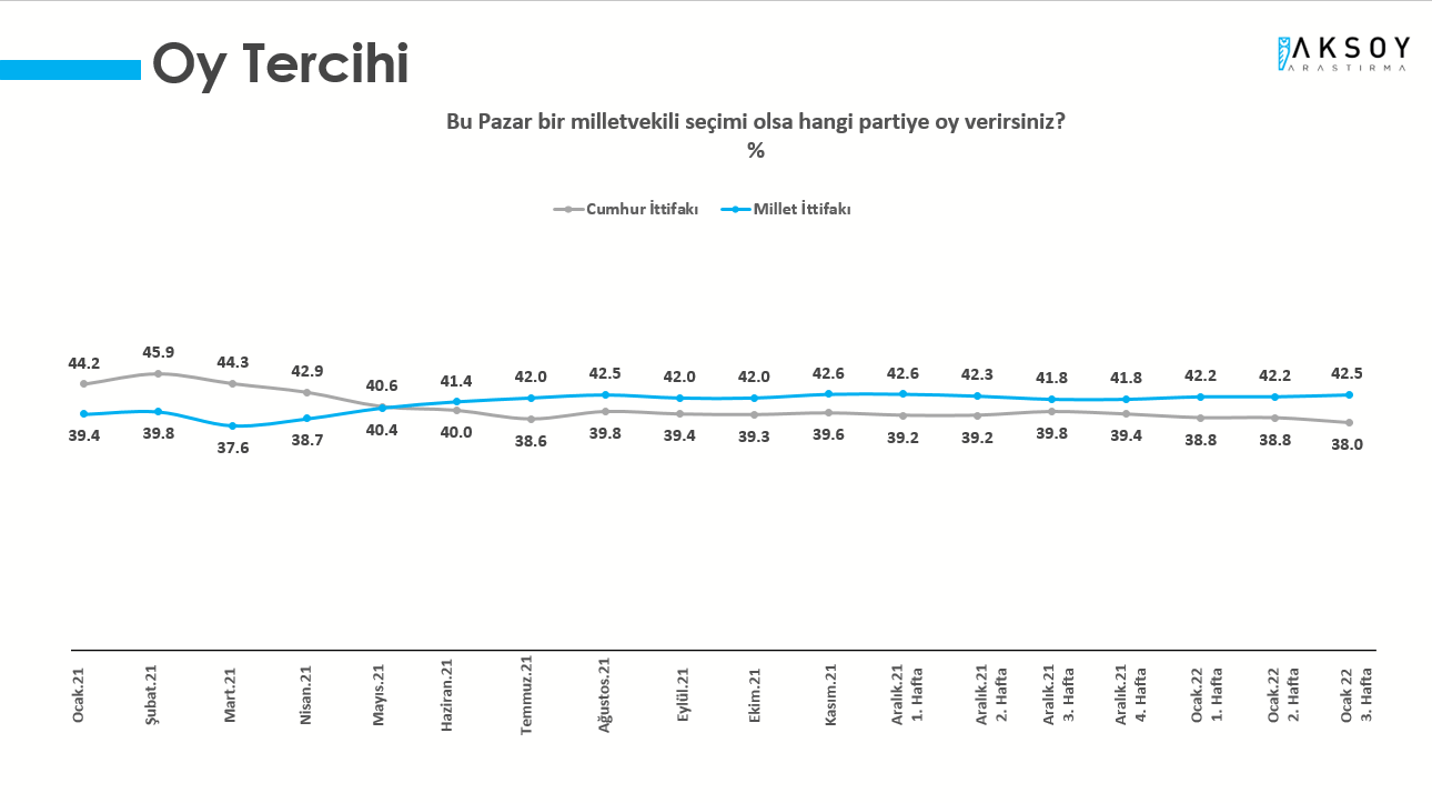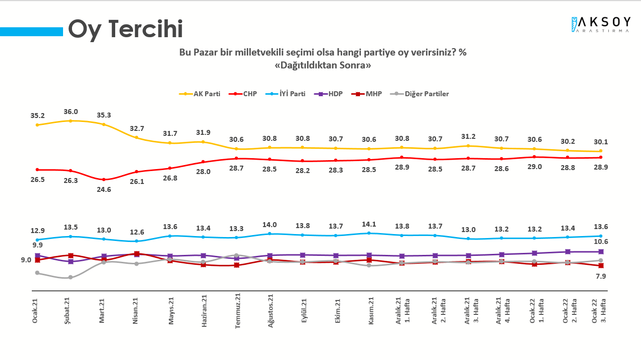 Aksoy Araştırma tarafından hazırlanan ve seçmenin nabzını anlık ölçen Türkiye Monitörü araştırmasının 2022 Ocak 3 Hafta sonuçları açıklandı. Araştırmada dikkat çeken bulguların başında partilerin oy oranları yer aldı.