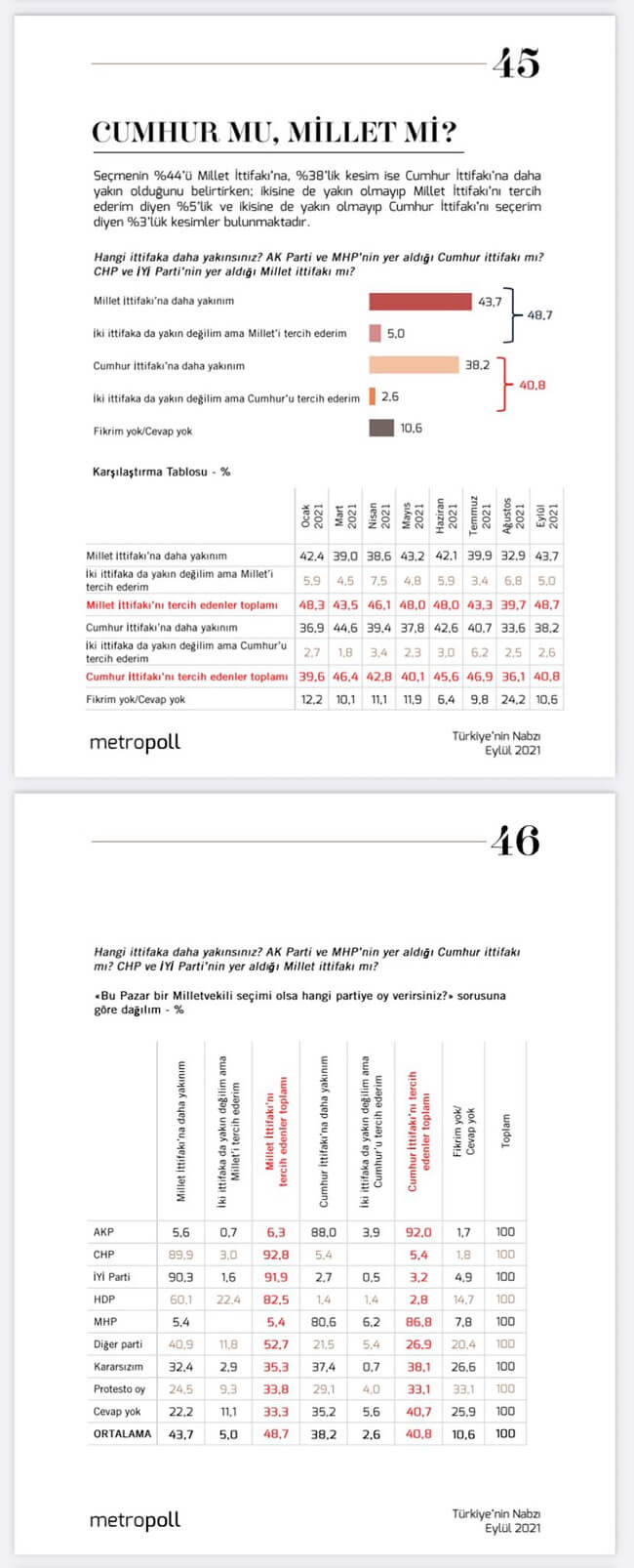 Metropoll Araştırma, Eylül ayı anket sonuçlarını açıkladı. "Hangi İttifaka daha yakınsınız?" sorusunun sorulduğu anketten çarpıcı sonuçlar çıktı. Cumhur İttifakı ile Millet İttifakı arasındaki fark yüzde 8 oldu.