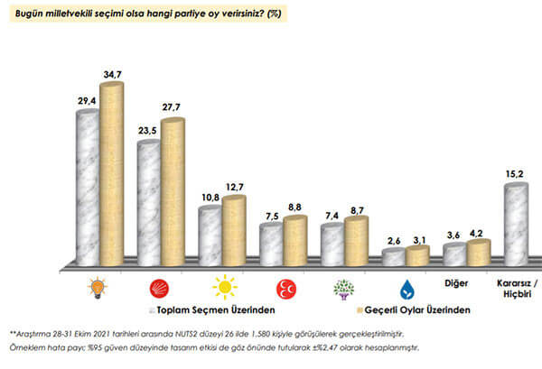 Area Araştırma Şirketi tarafından 26 ilde 28 – 31 Ekim 2021 tarihleri arasında 18 yaş ve üzeri 1.580 kişi ile yapılan son anket sonuçları kamuoyuna duyuruldu. Son ankette katılımcılara, “Bugün milletvekili seçimi olsa hangi partiye oy verirsiniz?” sorusu soruldu.