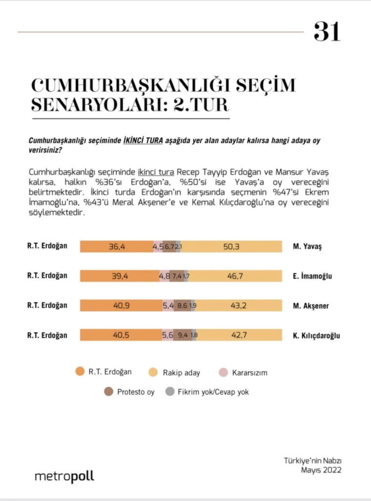 Öte yandan ikinci turda Erdoğan’ın karşısındaki seçmenin yüzde 47.6’sı İBB Başkanı Ekrem İmamoğlu’na, yüzde 43.2’si İYİ Parti Genel Başkanı Meral Akşener’e ve yüzde 42.7’si de CHP lideri Kemal Kılıçdaroğlu’na oy vereceğini ifade etti.
