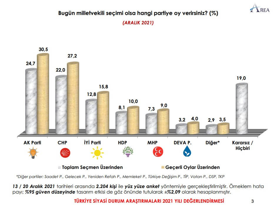 Area Araştırma’nın İstanbul, Tekirdağ, İzmir, Bursa, Ankara, Adana, Kayseri, Samsun, Trabzon, Erzurum, Malatya ve Diyarbakır’da gerçekleştirdiği ve 2 bin kişinin katıldığı “Türkiye Siyasi Gündem Araştırmaları – 2021 Genel Değerlendirmesi” araştırması tamamlandı.