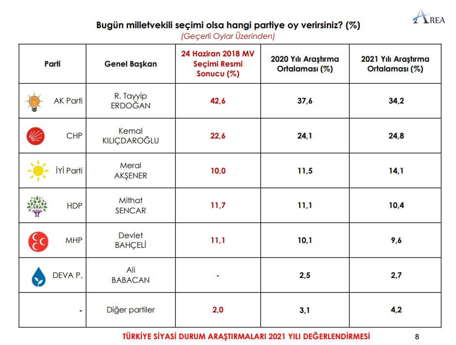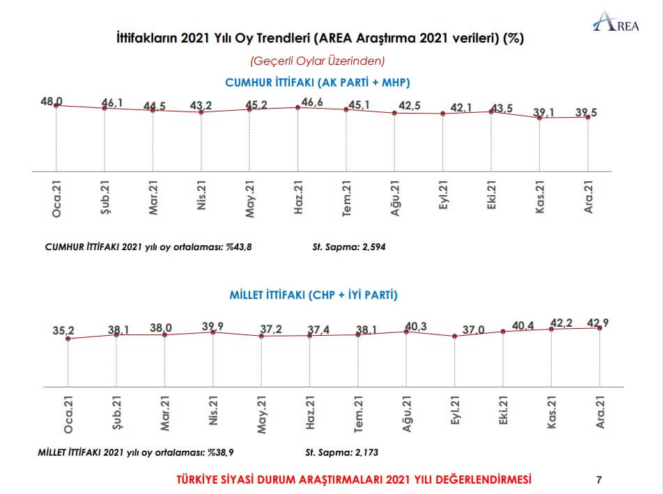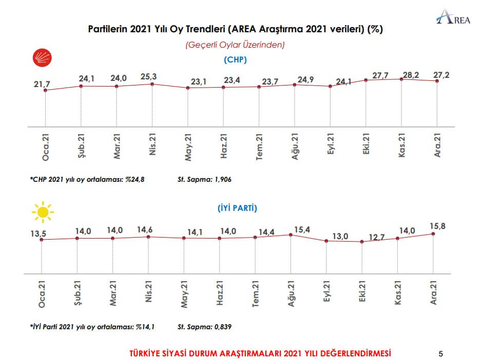 Area tarafından; Partilerin 2021 Yılı Oy Trendleri de derlendi. AKP ve MHP’nin 2021 trendi şöyle…