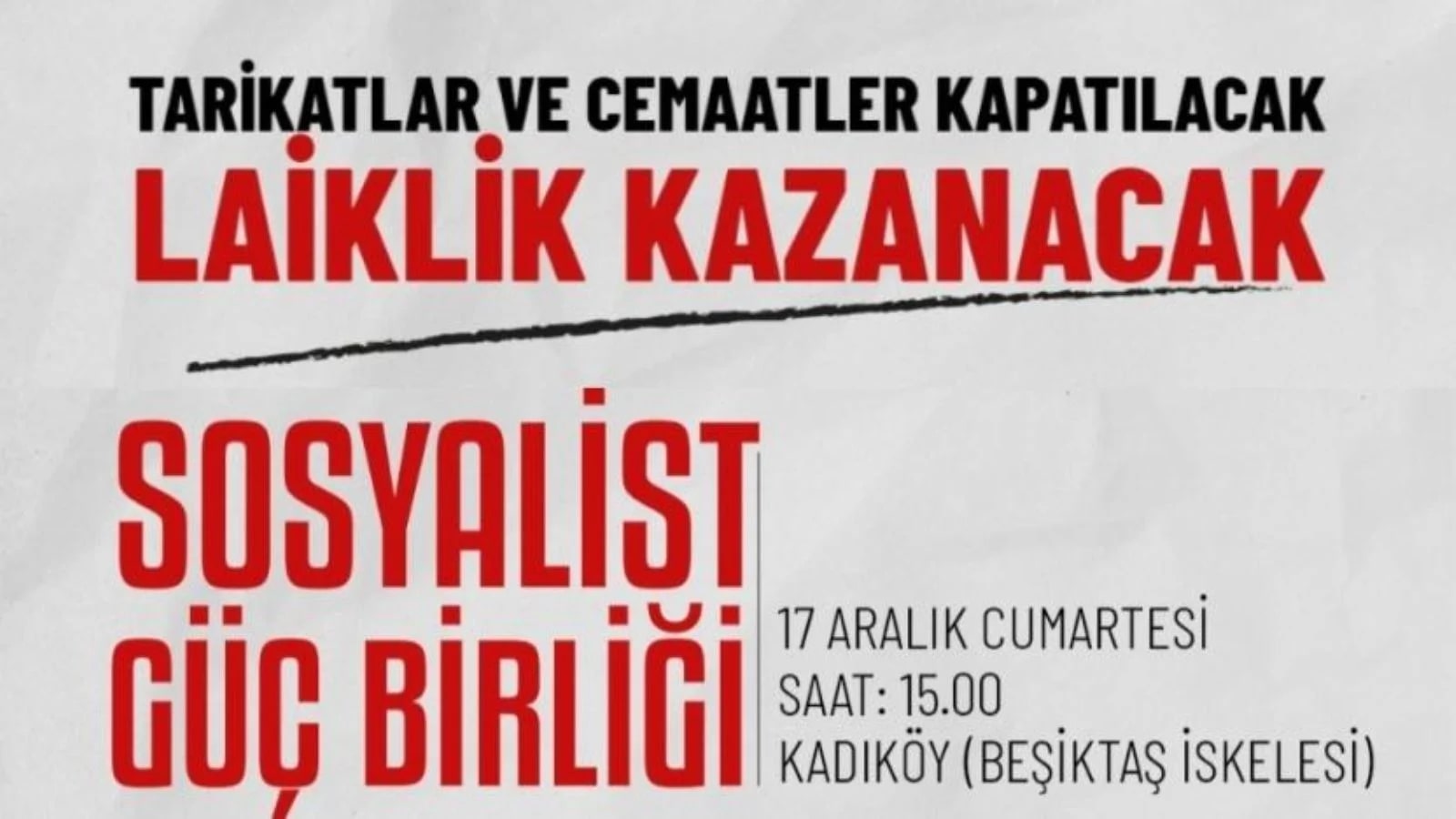 “Tarikat ve cemaat karanlığına karşı, çocuklarımızın geleceği ve aydınlık bir gelecek için tüm ilerici, aydın, yurtsever emekçi halkımızı, gençleri, kadınları, demokratik kamuoyunu laikliğe sahip çıkmak için 17 Aralık Cumartesi Saat 15:00’te Kadıköy’de (Beşiktaş İskelesi) buluşmaya çağırıyoruz.”