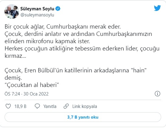 “Bir çocuk ağlar, Cumhurbaşkanı merak eder. Çocuk, derdini anlatır ve ardından Cumhurbaşkanımızın elinden mikrofonu kapmak ister. Herkes çocuğun atikliğine tebessüm ederken lider, çocuğu kırmaz… Çocuk, Eren Bülbül’ün katillerinin arkadaşlarına “hain” demiş. “Çocuktan al haberi”