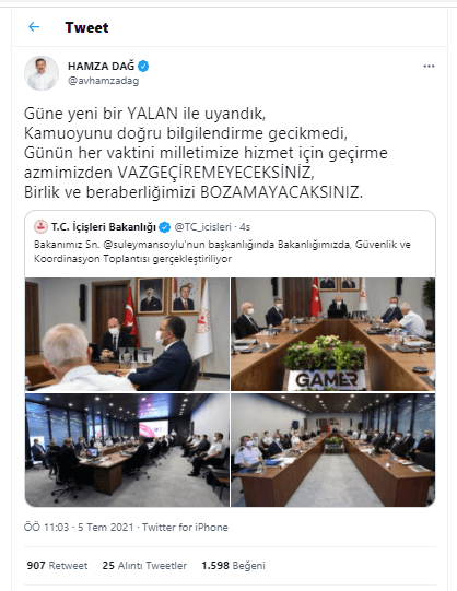 Hamza Dağ, “Güne yeni bir YALAN ile uyandık, Kamuoyunu doğru bilgilendirme gecikmedi, Günün her vaktini milletimize hizmet için geçirme azmimizden VAZGEÇİREMEYECEKSİNİZ, Birlik ve beraberliğimizi BOZAMAYACAKSINIZ” ifadelerini kullandı.