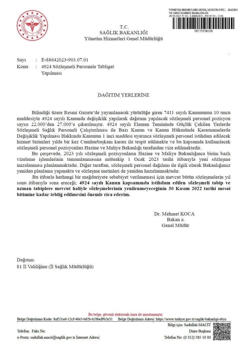 “Sözleşmesi iptal edilenler arasında bugüne kadar eleman temininde güçlük çekildiği için sözleşmeli çalıştırılan birçok hekimin sözleşmesi 31 Aralık 2022 itibariyle sonlanacak ve sözleşmesi yenilenmeyecek. Bu sözleşme iptalleriyle birçok meslektaşımız mağdur edildi. 4924 Sayılı “Eleman temininde güçlük çekilen yerlerde sözleşmeli sağlık personeli çalıştırılması” kanununda kastedilen yerlerde çoğunlukla DHY (Devlet Hizmet Yükümlülüğü) hekimlerin çalışmasına rağmen bu kadrolardan DHY hekimlerin yararlanamaması adil değildir. 1. Basamak hekimlerine hiç kadro verilmemiş, daha önce sözleşme kadrosunda olan 1. Basamak hekimlerimizin kadroları feshedilmiştir. Bugüne kadar sözleşmeli çalışmış ve sözleşme feshine neden olacak bir hatası olmamış meslektaşlarımız da sözleşme iptali ile karşılaşmıştır. Sağlıkçıların sözleşmeli olarak istihdam edilmesi kabul edilemez. Aynı kurumda aynı şartlarda ve aynı işi yapan birçok meslektaşımız arasında sözleşmeli olmak ya da olmamak sonucu adaletsizlikler oluşup bu durum çalışma barışını bozmaktadır. Bunun yanı sıra acil serviste çalışan hekimlerimiz de bu kadro dağılımında yok sayılmıştır. 4924 sözleşme kriterleri ve mobbinge açık uygulanış şekli hekimlik mesleğinin doğasına aykırı olup mesleki saygınlık ile bağdaşmamaktadır.”