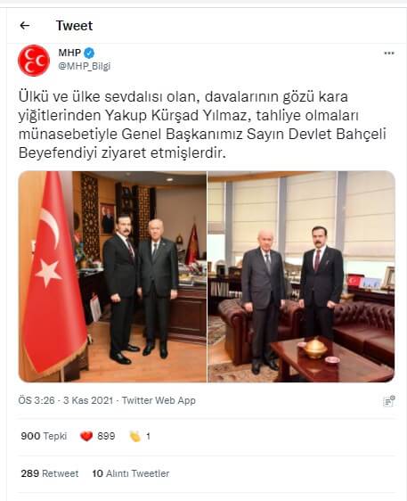 “Ülkü ve ülke sevdalısı olan, davalarının gözü kara yiğitlerinden Yakup Kürşad Yılmaz, tahliye olmaları münasebetiyle Genel Başkanımız Sayın Devlet Bahçeli Beyefendiyi ziyaret etmişlerdir.”
