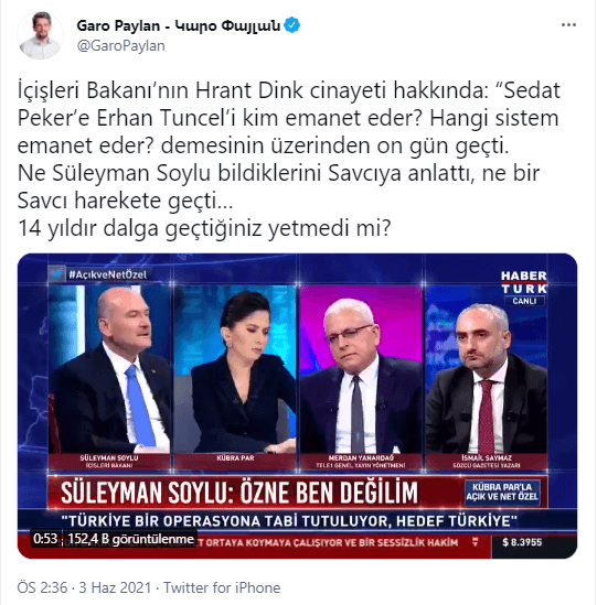 HDP İstanbul Milletvekili Garo Paylan, İçişleri Bakanı Süleyman Soylu’nun katıldığı televizyon programında AGOS Gazetesi Genel Yayın Yönetmeni Hrant Dink cinayeti hakkında sarf ettiği sözler hakkında bir paylaşım yaptı.