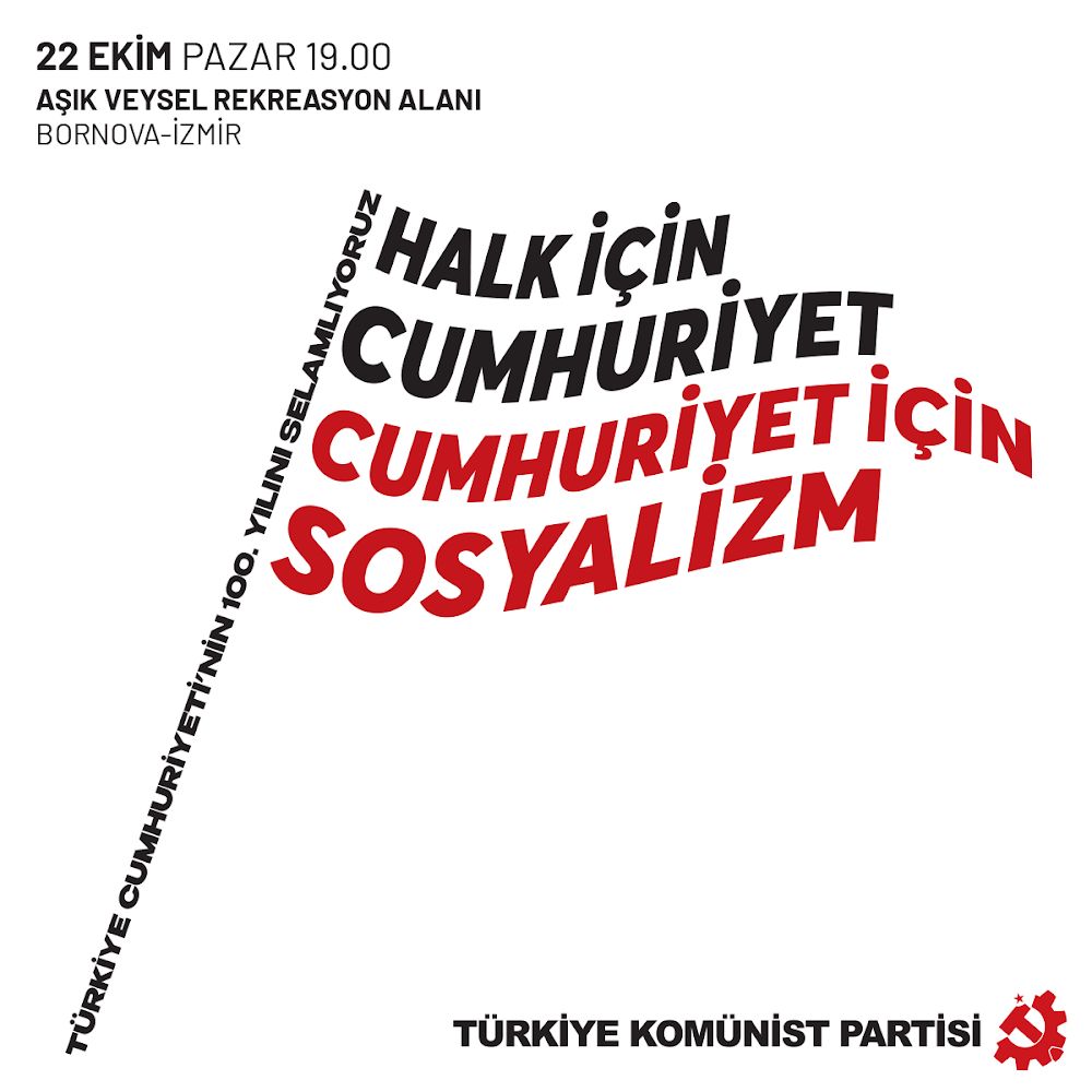 Türkiye Komünist Partisi (TKP) bir açıklama yayınlayarak, Cumhuriyet’in yüzüncü yılına ilişkin etkinlik planını duyurdu. TKP yaptığı açıklamada, “22 Ekim Pazar günü saat 19.00’da İzmir’de Aşık Veysel Rekreasyon Alanı’nda hem 100’üncü yılı selamlayacağız hem de bu 100 yılın muhasebesini dürüstçe yapacağız. Sözümüzle, sanatımızla. Karanlığa öfkemizi, ülkemiz ve halkımıza olan inancımızı binlerce kişinin ortak iradesi olarak haykıracağız” ifadelerini kullandı.