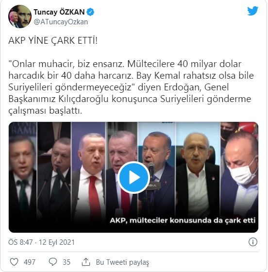Çavuşoğlu’nun açıklamalarının ardından CHP İzmir Milletvekili Tuncay Özkan sosyal medya hesabından paylaşımda bulundu. Özkan, Cumhurbaşkanı Erdoğan’ın Kemal Kılıçdaroğlu’nun sözlerinin ardından Suriyelileri göndermeye karar verdiğini söyledi.