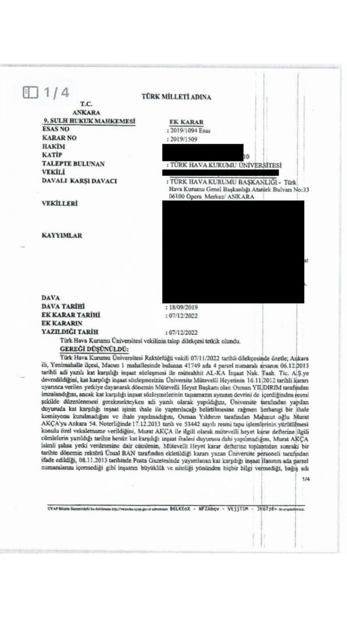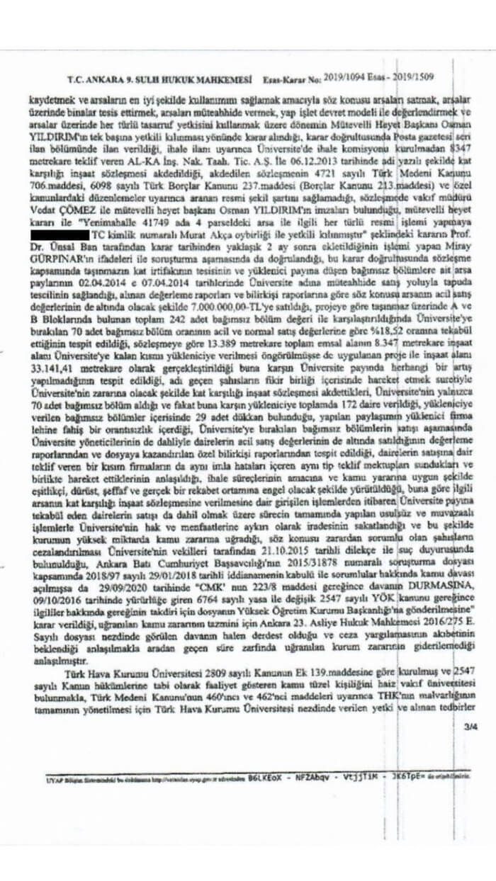 Söz konusu üniversiteye ait arazi satışının birden fazla usulsüzlük içerdiğini ifade eden CHP’li Başarır, “Yapılan bu usulsüzlükler Ankara 9. Sulh Hukuk Mahkemesi tarafından tespit edilmiş ve arazinin üniversiteye geri verilmesi karara bağlanmıştır. Ayrıca üçüncü şahıslara ait bağımsız bölüm tapularından doğan mağduriyetlerin giderilmesi, ihalede yetkisiz ve temelde geçersiz işlem yapan , iradeyi fesata uğratan şahıslara yöneltilmesine karar verilmiştir. Peki bu iradeyi fesata uğratan şahıslar arasında kimler var; tabi ki en başta AKP Erzurum Milletvekili Zehra Taşkesenlioğlu Ban’ın eşi Ünsal Ban var” sözlerini dile getirdi.
