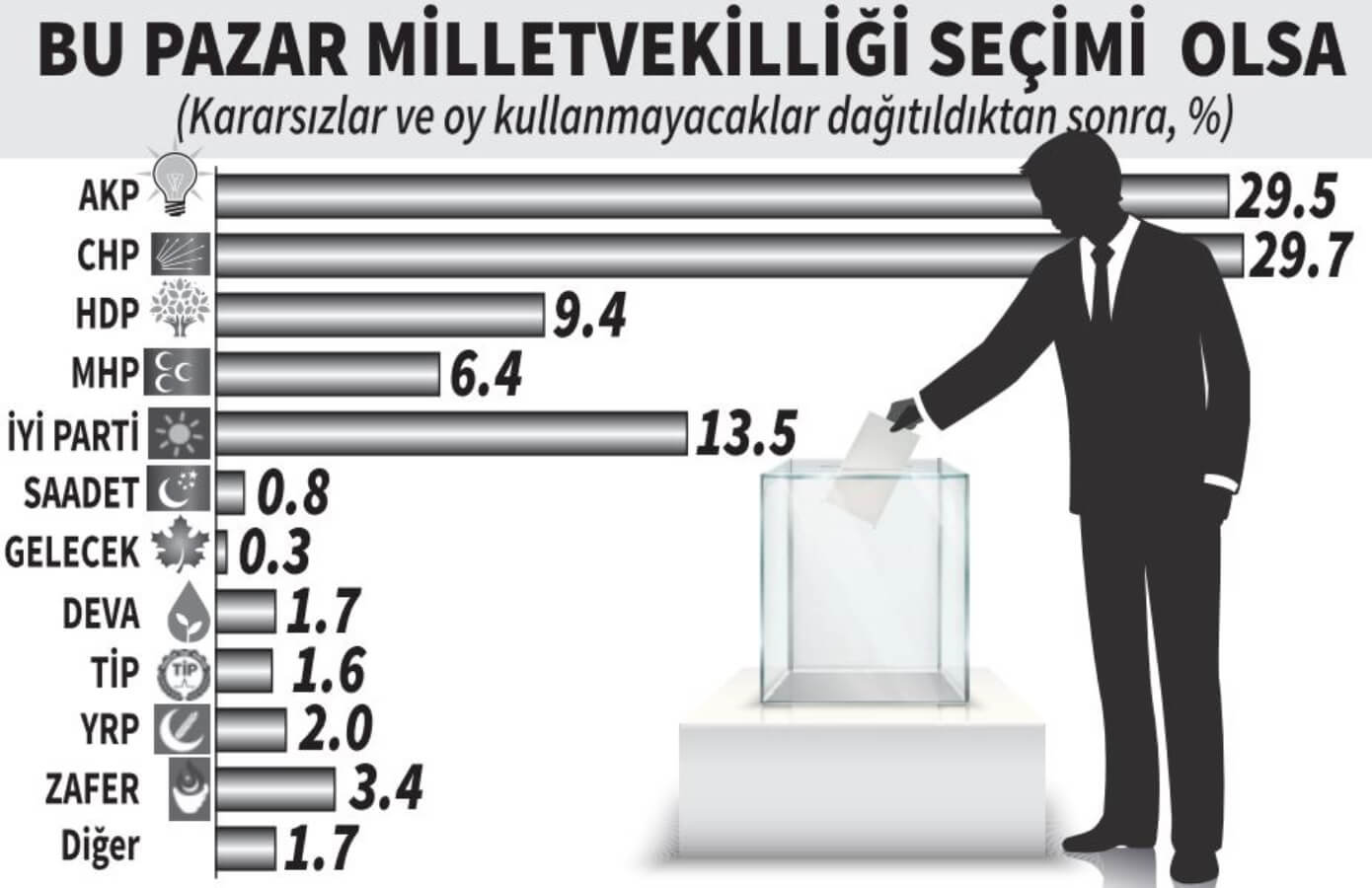 Cumhuriyet’ten Sena Tufan’ın haberine göre; anket sonuçlarına kararsızlar ve oy kullanmayacaklar dağıtıldıktan sonra CHP’nin oyları AKP’nin önüne geçti. Buna göre, CHP yüzde 29.7, AKP yüzde 29.5, HDP 9.4, MHP 6.4, İYİ Parti 13.5, Saadet Partisi 0.8, Gelecek Partisi 0.3, DEVA 1.7 oranında oy aldı.