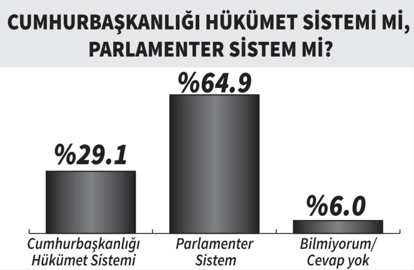 Öte yandan katılımcılara yöneltilen “Cumhurbaşkanlığı hükümet sistemi mi, parlamenter sistem mi?” sorusuna yurttaşların yüzde 64.9’u “parlamenter sistem” derken yalnızca yüzde 29.1’i “Cumhurbaşkanlığı hükümet sistemi” dedi. Katılımcıların yüzde 6’sı ise “bilmiyorum” yanıtını verdi.
