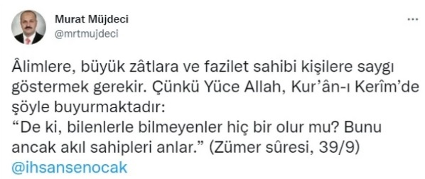 Bir diğer paylaşımında da ilahiyatçı İhsan Şenocak’ı etiketleyen Müjdeci, şu ifadeleri kullandı: