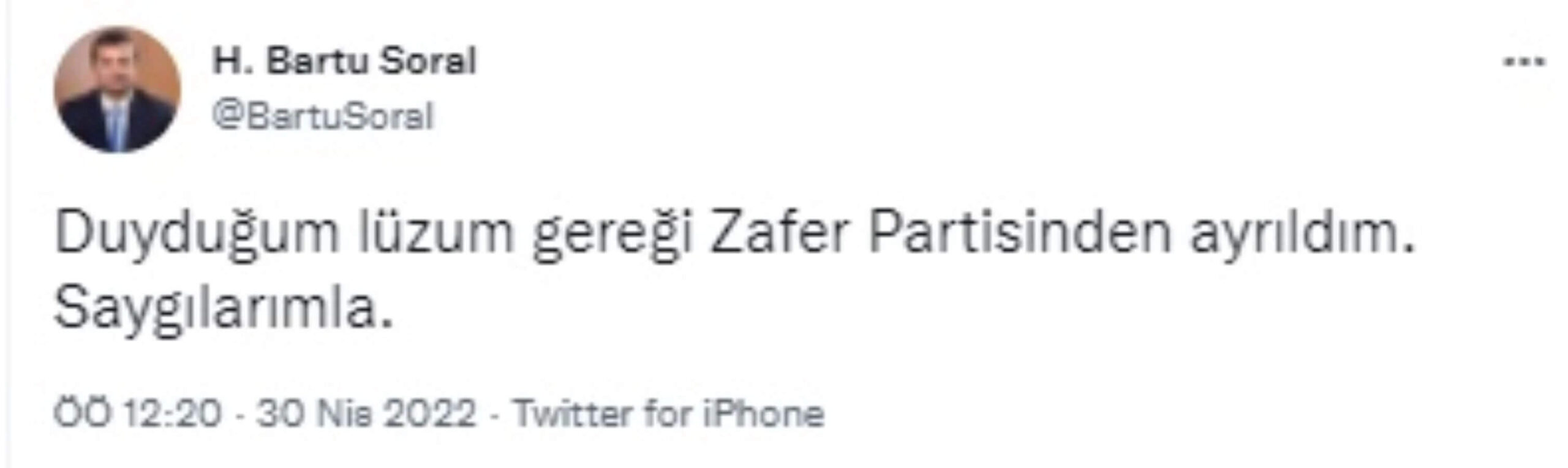 Soral, Zafer Partisi’nden istifasını Twitter hesabından yaptığı kısa açıklama ile duyurdu. Soral, “Duyduğum lüzum gereği Zafer Partisi’nden ayrıldım. Saygılarımla” ifadelerini kullandı.