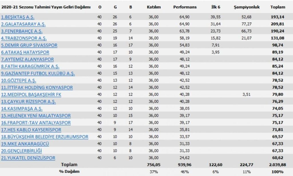 Süper Lig’de sezon sona ererken 21 takım yayın gelirlerini paylaştı. En çok payı Beşiktaş şampiyon olmasına rağmen Galatasaray kazanırken, en düşük geliri ise Denizlispor elde etti.