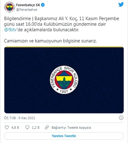 Fenerbahçe, Başkan Ali Koç'un perşembe günü açıklamalarda bulunacağına dair paylaşımda bulundu.