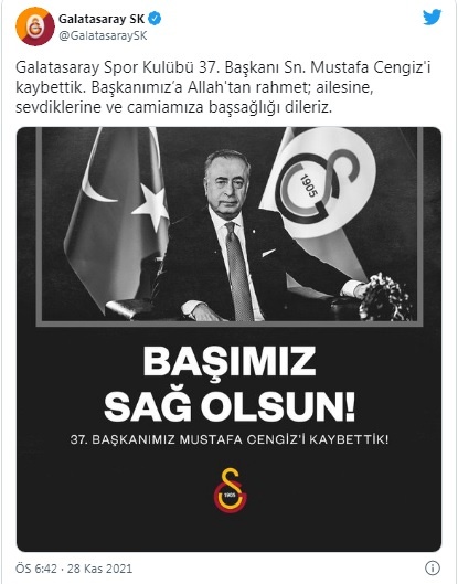 Galatasaray’dan yapılan açıklamada, “Galatasaray Spor Kulübü 37. Başkanı Sn. Mustafa Cengiz’i kaybettik. Başkanımız’a Allah’tan rahmet; ailesine, sevdiklerine ve camiamıza başsağlığı dileriz.” ifadeleri kullanıldı.