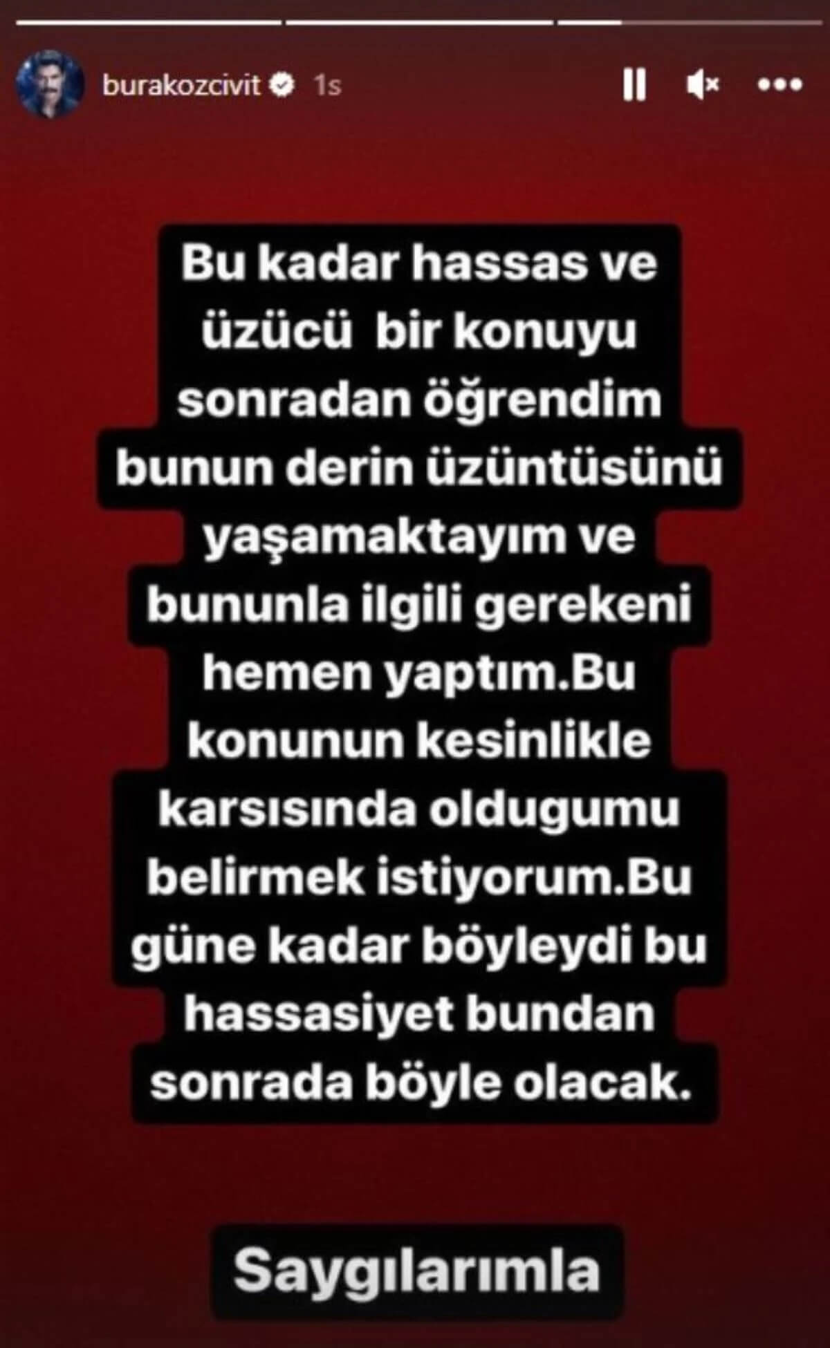 Eleştirilerin ardından Instagram hesabından paylaşım yapan oyuncu Burak Özçivit, “Bu kadar hassas ve üzücü bir konuyu sonradan öğrendim. Bunun derin üzüntüsünü yaşamaktayım ve bununla ilgili gerekeni hemen yaptım. Bu konunun kesinlikle karşısında olduğumu belirtmek istiyorum. Bu güne kadar böyleydi bu hassasiyet bundan sonra da böyle olacak” dedi.
