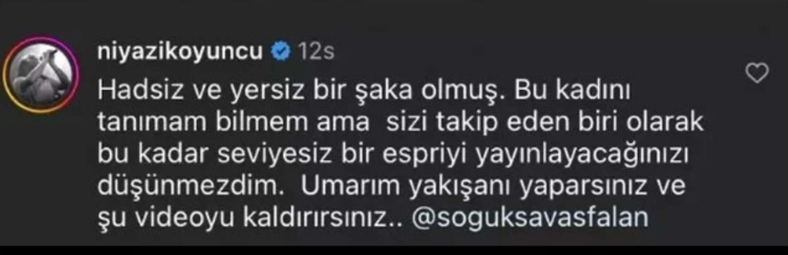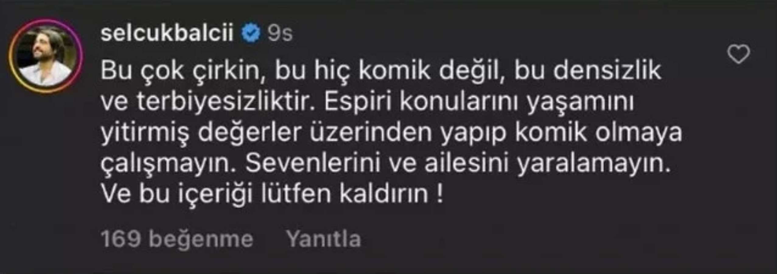 Sanatçı Selçuk Balcı ise “Bu çok çirkin, hiç komik değil, bu densizlik ve terbiyesizliktir. Espri konularını yaşamını yitirmiş değerler üzerinden yapıp komik olmaya çalışmayın. Sevenlerini ve ailesini yaralamayın. Ve bu içeriği lütfen kaldırın!” dedi.