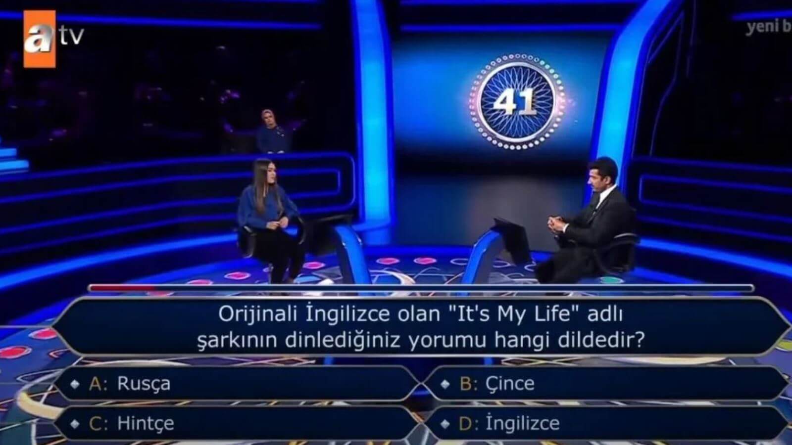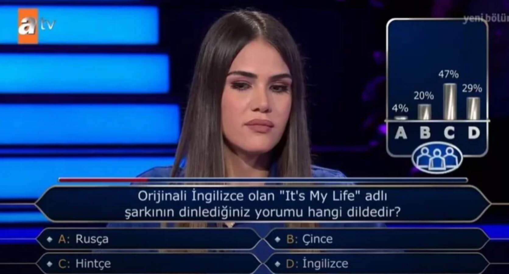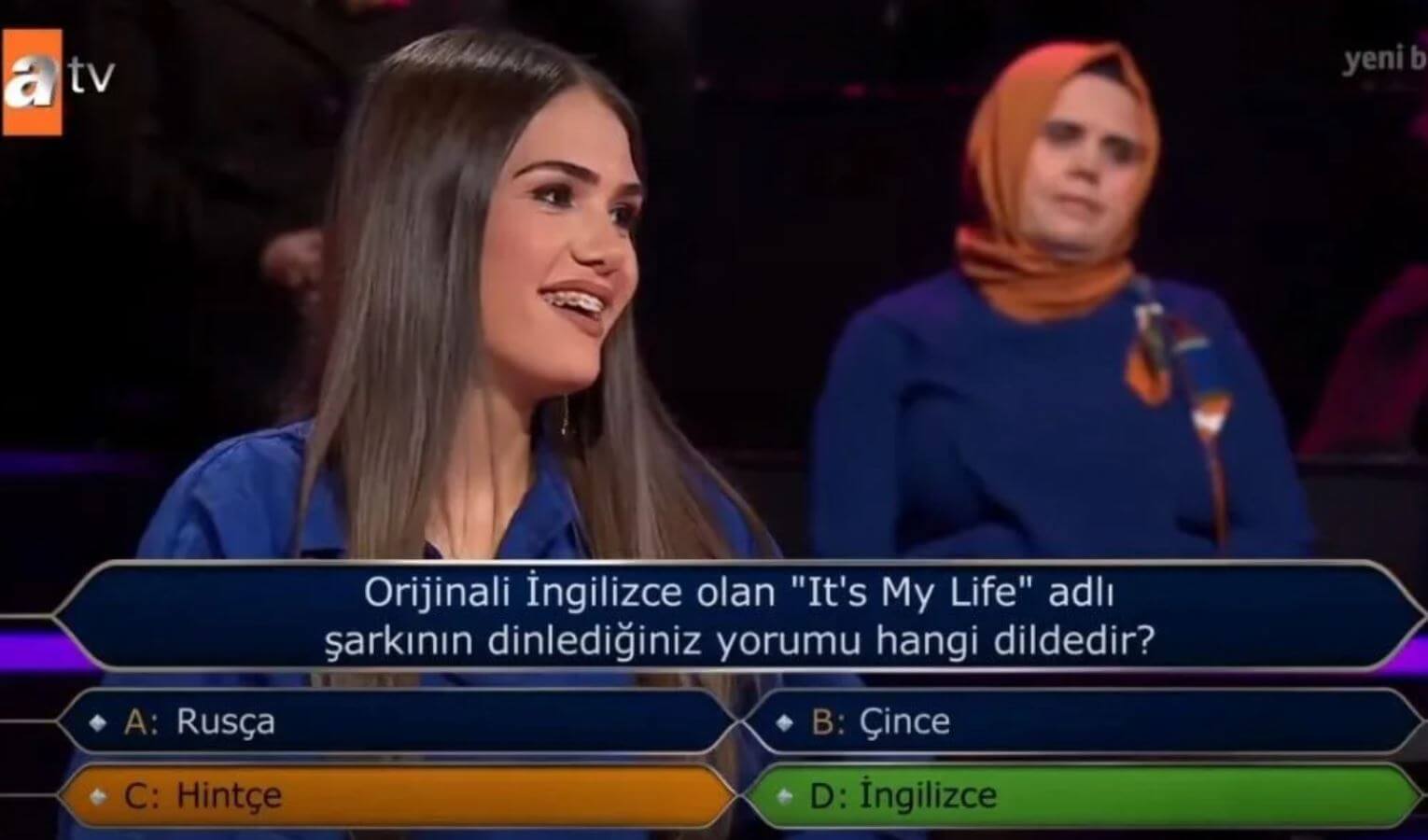 Dereli’nin karşısına, “Orjinali İngilizce olan ‘It’s My Life’ adlı şarkının dinlediğiniz yorumu hangi dildedir?” sorusu çıktı.