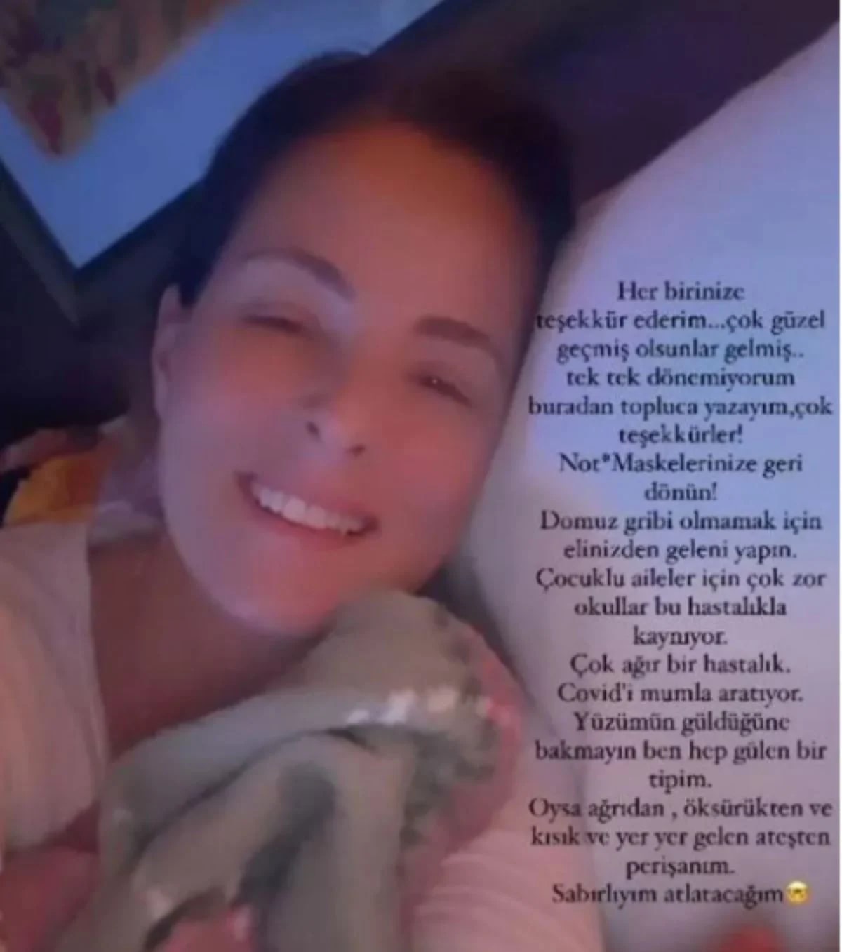 “Her birinize teşekkür ederim… Çok güzel geçmiş olsunlar gelmiş… Tek tek dönemiyorum buradan topluca yazayım, çok teşekkürler! Not, maskelerinize geri dönün! Domuz gribi olmamak için elinizden geleni yapın. Çocuklu aileler için çok zor okullar bu hastalıkla kaynıyor. Çok ağır bir hastalık. Covid’i mumla aratıyor. Yüzümün güldüğüne bakmayın ben hep gülen bir tipim. Oysa ağrıdan öksürükten ve kısık ve yer yere gelen ateşten perişanım. Sabırlıyım atlatacağım”