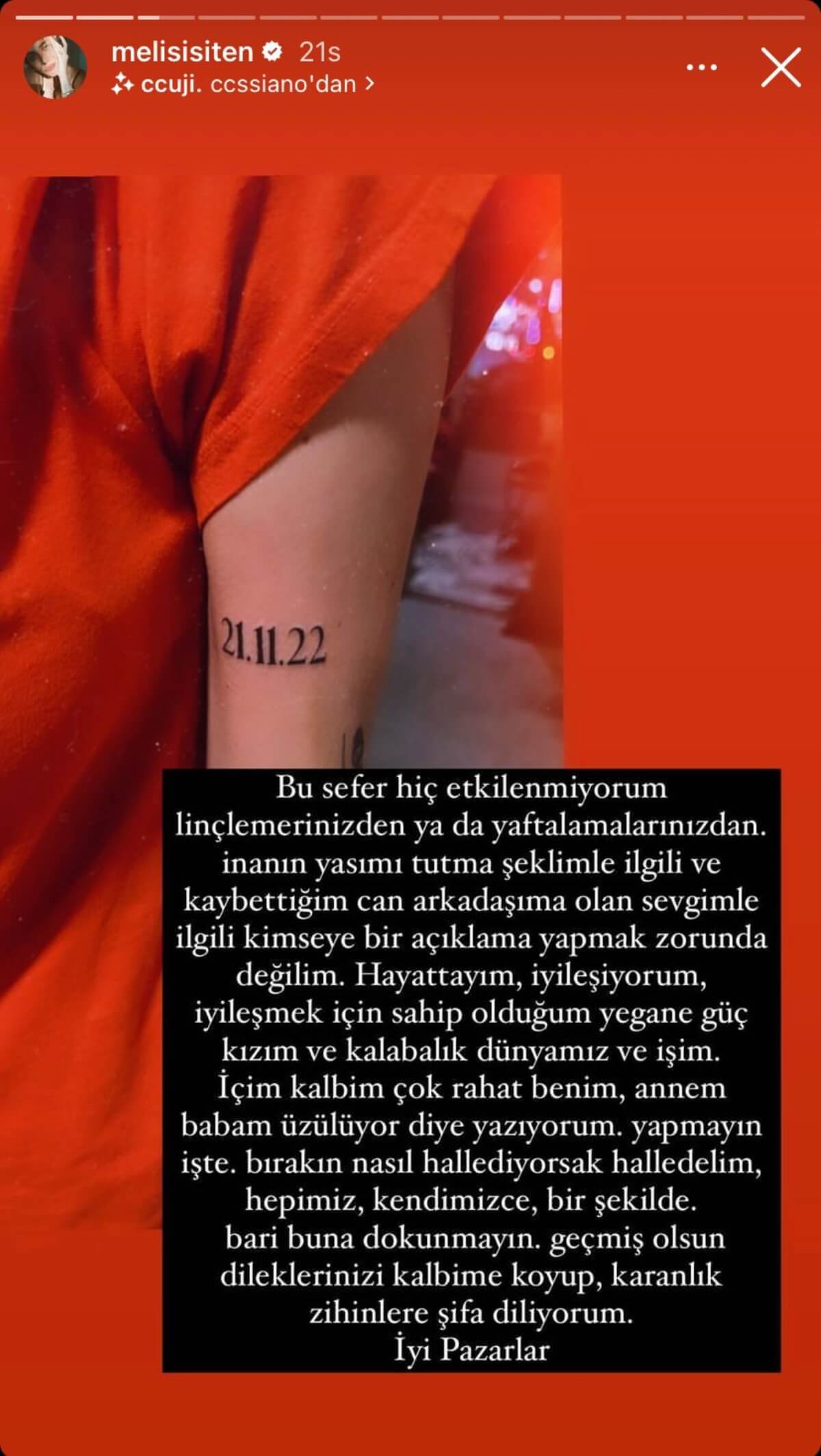 “Bu sefer hiç etkilenmiyorum linçlemelerinizden ya da yaftalamalarınızdan. İnanın yasımı tutma şeklimle ilgili ve kaybettiğim can arkadaşıma olan sevgimle ilgili kimseye bir açıklama yapmak zorunda değilim. Hayattayım, iyileşiyorum, iyileşmek için sahip olduğum yegâne güç; kızım, kalabalık dünyamız ve işim. Benim içim kalbim çok rahat, annem babam üzülüyor diye yazıyorum. Yapmayın işte, bırakın nasıl hallediyorsak halledelim; hepimiz, kendimizce, bir şekilde… Bari buna dokunmayın. Geçmiş olsun dileklerinizi kalbime koyup, karanlık zihinlere şifa diliyorum.”