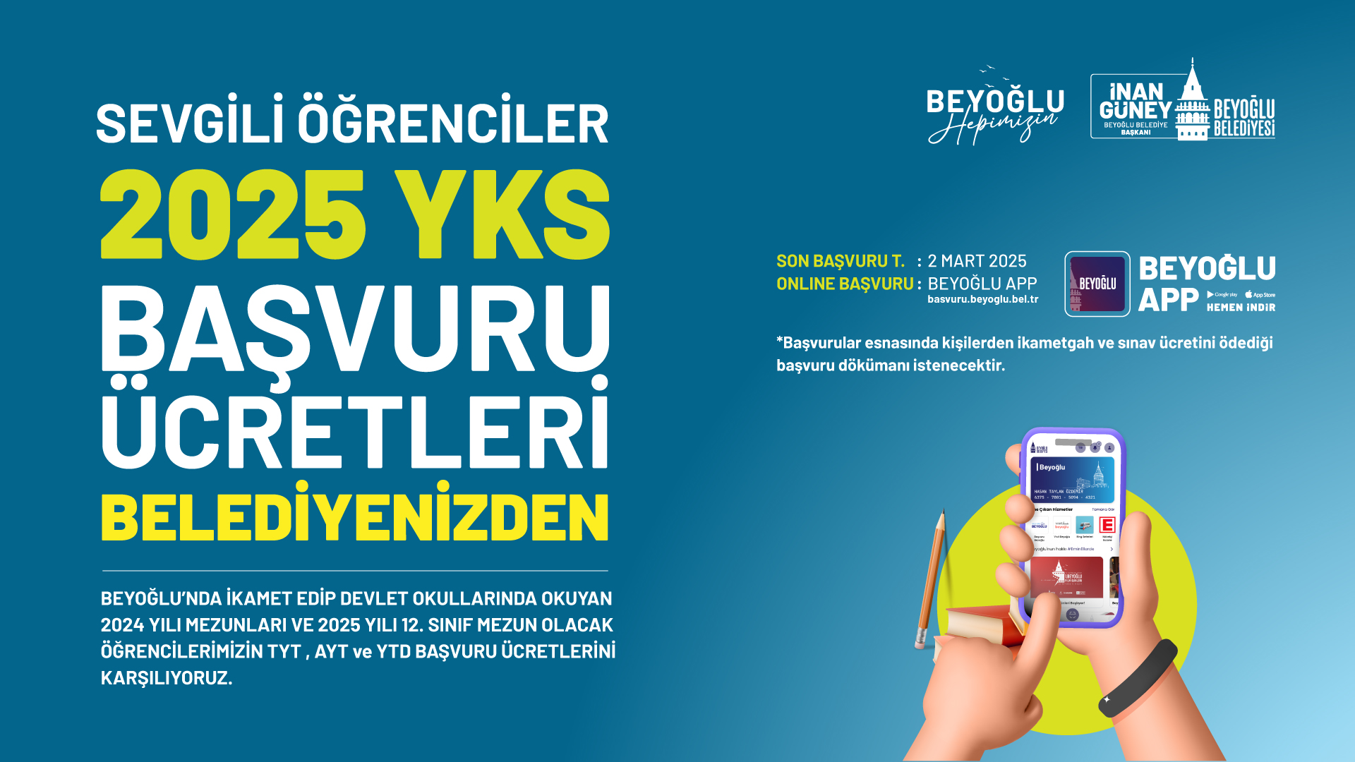 Beyoğlu Belediyesi, Beyoğlu’nda ikamet eden, 2024 yılında liseden mezun olan veya 2024-2025 eğitim öğretim yılında mezun olacak öğrencilerin YKS sınavı ücretlerinin belediye tarafından karşılanacağını açıkladı.