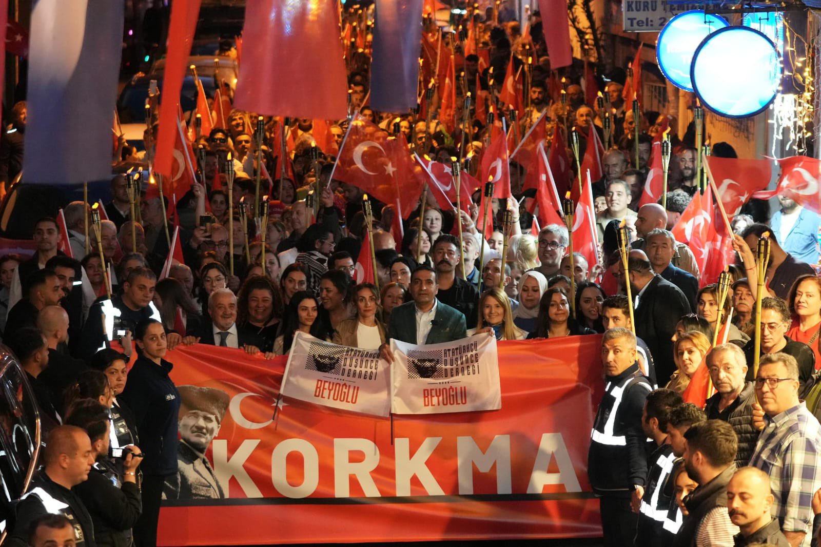 Beyoğlu Belediye Başkanı İnan Güney yürüyüşün ardından yaptığı konuşmasında “Bizler haysiyetleri ve hürriyetleri için cesaretle direnenlerin evladıyız. Umudun olmadığı yerde umut, çarenin olmadığı yerde çare olanların torunlarıyız. Köylünün tarlasından alıp cepheye sürdüğü kağnısıyla, bir kırık tüfeğin süngüsüyle düşmanla boğaz boğaza dövüşenlerin inancıyla, oğlunu orduya veren anaların duasıyla, ocağına ateş düşen hanelerin yürek yakan acısıyla, bir büyük milletin umuduyla biz bu vatanı kazandık. Bağımsızlığımızı kazandık. Kayıtsız şartsız egemenliğimizi kazandık. Egemenlik kayıtsız şartsız milletindir diyenlerin karşısında kimse duramadı.” İfadelerini kullandı.