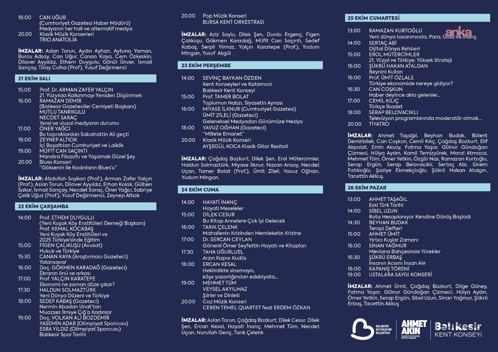 Büyükşehir Belediye Başkanı Ahmet Akın, “17-26 Ekim arasında Avlu Kongre ve Kültür Merkezi’nde 1. Balıkesir Kitap Fuarı’nı başlatıyoruz. Birbirinden değerli yazarlarımızı, edebiyatçılarımızı ağırlayacağımız fuarımıza tüm hemşehrilerimizi bekliyoruz. Bu fuarı da çok önemsiyoruz. Çünkü kitap aydınlanma ve toplumsal ilerleme demektir. Cumhuriyetimizin kültür ve sanat birikimini daha ileriye taşımak, Balıkesirlileri Gönenli Ömer Seyfettin ile ismi Edremit ile bütünleşen Sabahattin Ali ile buluşturmak, Ulu Önderimiz Gazi Mustafa Kemal Atatürk’ü ve Kuvayımilliye destanını bir kez daha dünden bugüne sağlam adımlarla taşımak için bu fuarı düzenliyoruz” dedi.