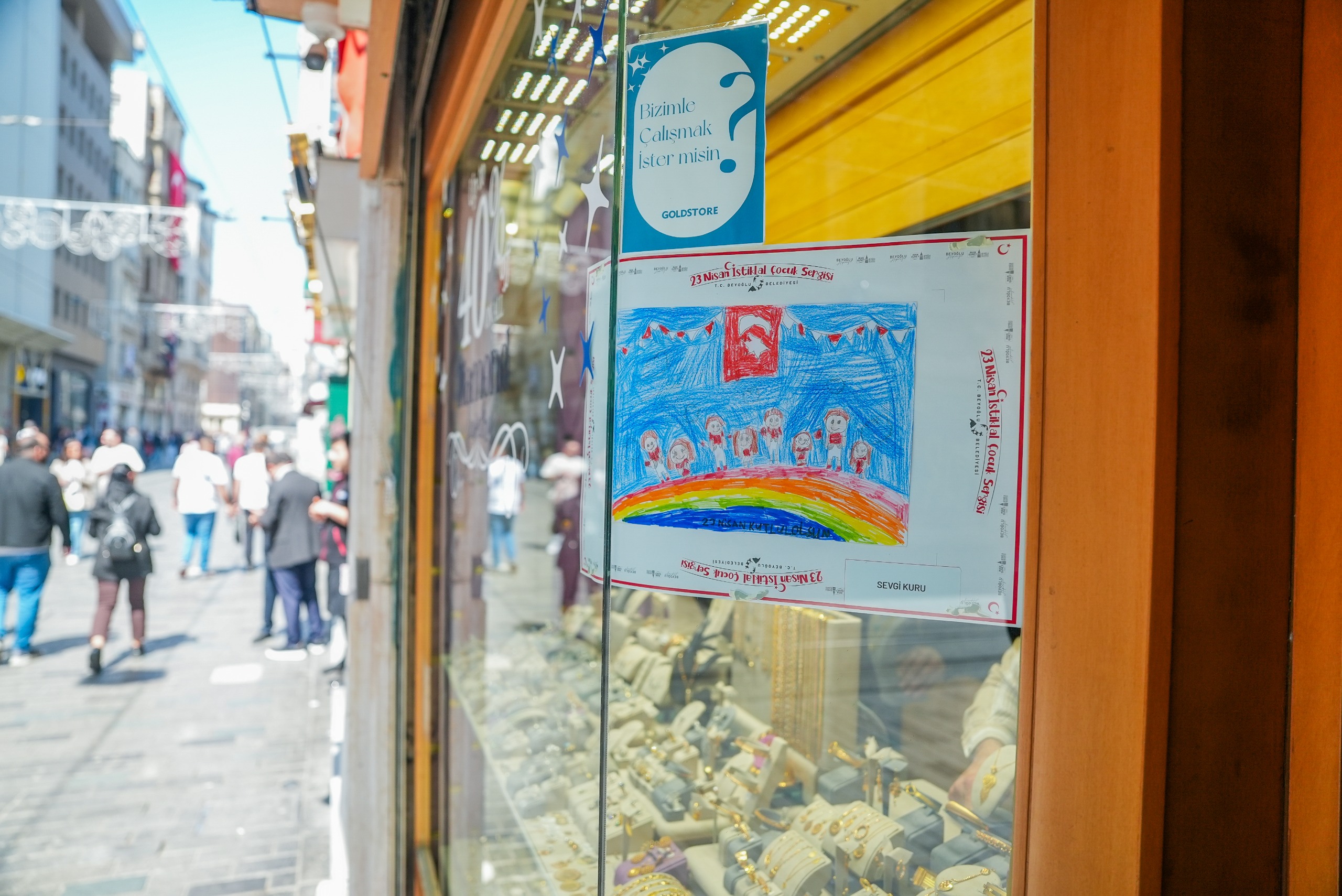 Beyoğlu'nun vitrini İstiklal Caddesi 23 Nisan'da çocukların çizdiği resimlerle rengarenk oldu. Çocukların hayal dünyasını yansıtan resimlerden oluşan sergi, cadde esnafının desteğiyle açık hava sergisine dönüştü.