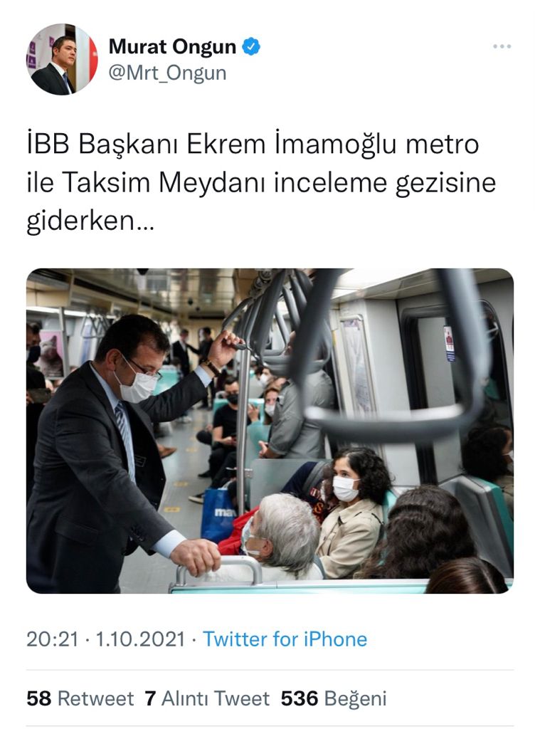 İBB Sözcüsü Murat Ongun twitter hesabından İstanbul Büyükşehir Belediye Başkanı Ekrem İmamoğlu’nun metroda çekilen fotoğrafını paylaşarak; ‘İBB Başkanı Ekrem İmamoğlu metro ile Taksim Meydanı inceleme gezisine giderken’ notunu düştü.
