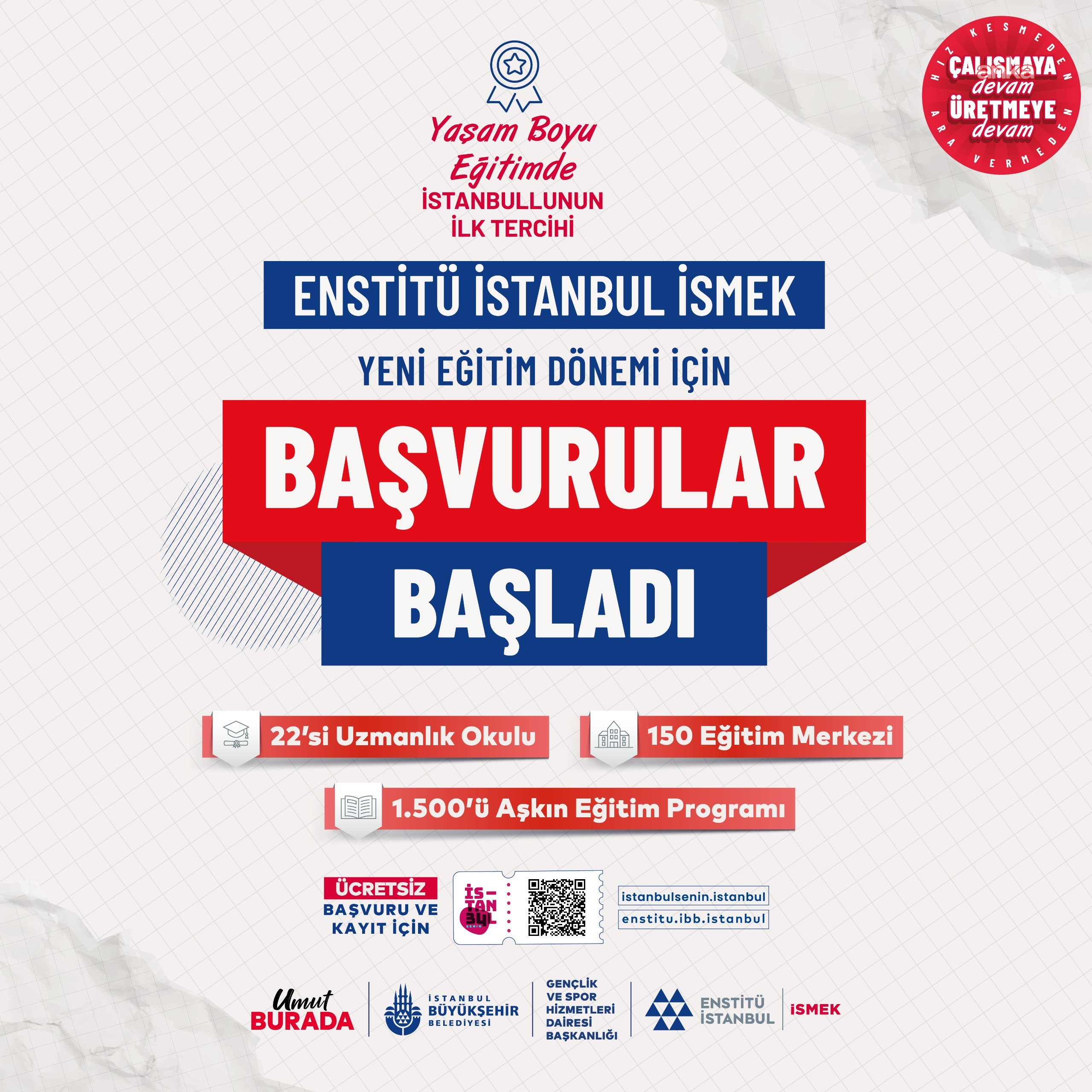 Ücretsiz eğitimlere katılmak isteyenler, enstitu.ibb.istanbul adresinden ve İstanbul Senin mobil uygulaması üzerinden başvurularını yapabiliyor. Enstitü İstanbul İSMEK’te kayıtlar yıl boyunca devam edecek.