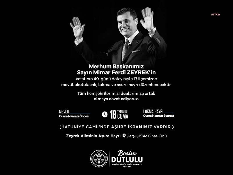 Büyükşehir Belediye Başkanı Besim Dutlulu, “Manisa’mızın yiğit evladı, merhum Manisa Büyükşehir Belediye Başkanımız Ferdi Zeyrek’in aramızdan ayrılışının 40. günü vesilesiyle, Cuma günü Manisa’mızın 17 ilçesinde mevlit okutacak; lokma ve aşure hayrı düzenleyeceğiz. Tüm halkımızı dualarımıza ortak olmaya davet ediyoruz” dedi.