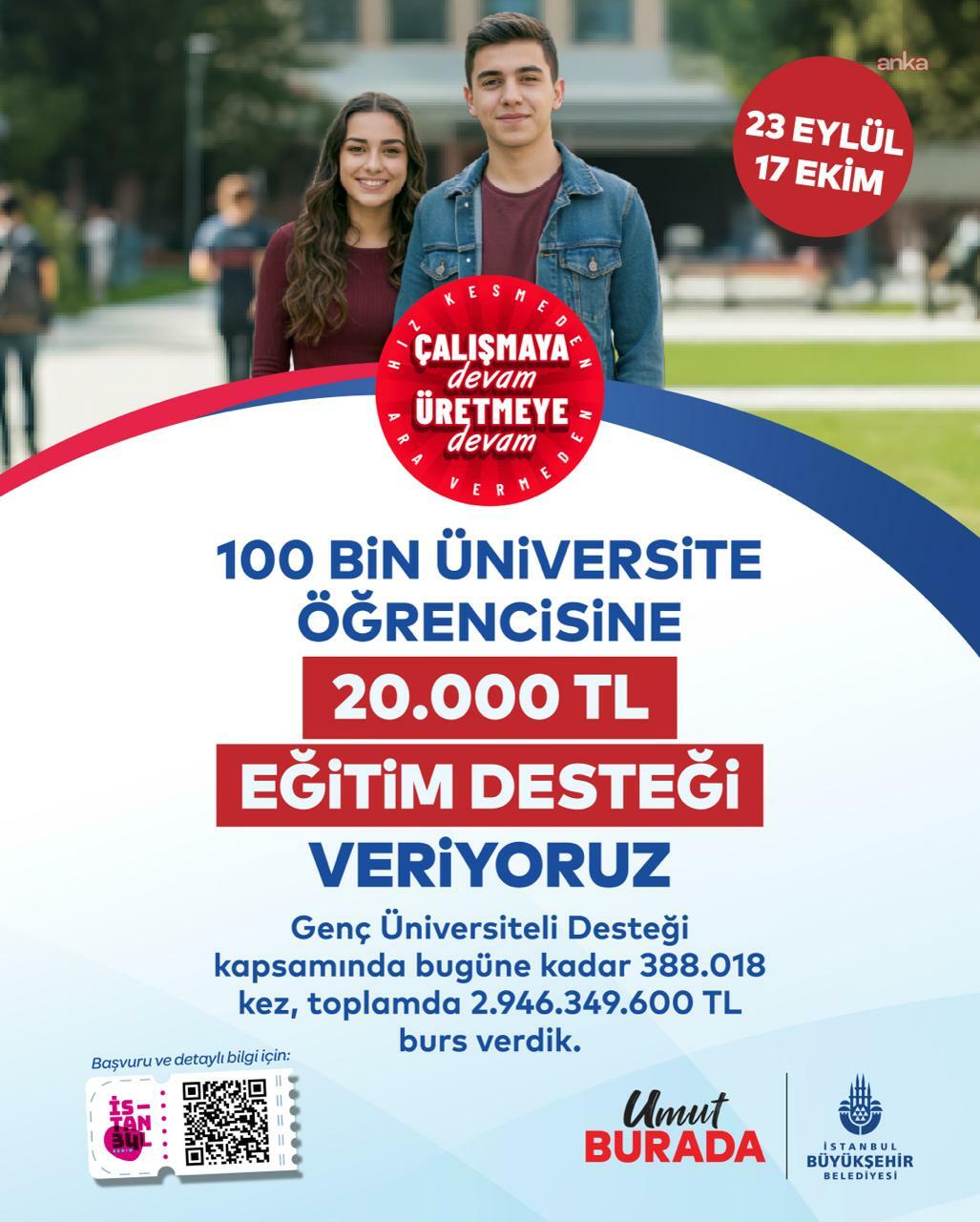 İstanbul Büyükşehir Belediyesi (İBB), üniversiteli öğrencilere verdiği ‘Genç Üniversiteli Eğitim Desteği’ne başvurular 23 Eylül’de başlıyor. Eğitim desteğiyle, bu yıl 100 bin öğrenciye 20 bin TL’lik maddi katkı sunulacak. Başvurular, 17 Ekim 2025 Cuma gününe kadar devam edecek.