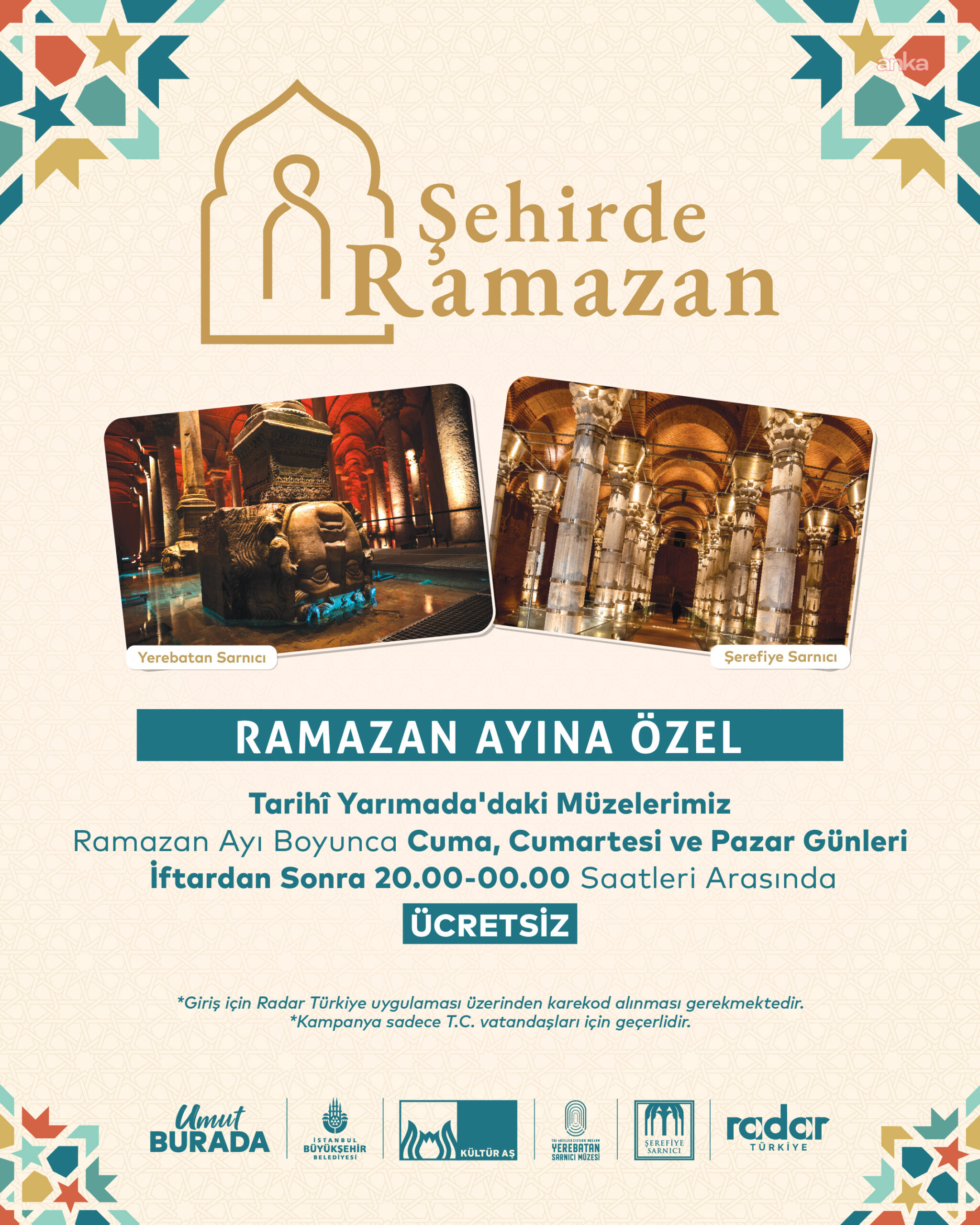 İBB iştiraki Kültür A.Ş. tarafından yürütülen program kapsamında, Yerebatan Sarnıcı ve Şerefiye Sarnıcı belirli günlerde ücretsiz olarak ziyarete açılacak. Panorama 1453 Tarih Müzesi’nde çocuklara yönelik atölyeler ve gösteriler düzenlenecek. Şerefiye Sarnıcı’nda tasavvuf dinletileri gerçekleştirilecek; İstanbul Kitapçısı şubelerinde söyleşiler ve indirim kampanyaları yapılacak. İBB, Ramazan ayı boyunca sosyal destek, kültür-sanat etkinlikleri ve ibadet alanlarına yönelik hizmetleriyle İstanbul’un manevi iklimine katkı sunmayı sürdürecek. Dayanışma ve paylaşma ruhunun güçlenmesi amacıyla hazırlanan programlarla, Ramazan’ın huzur ve bereketinin tüm İstanbullulara ulaşması hedefleniyor.
