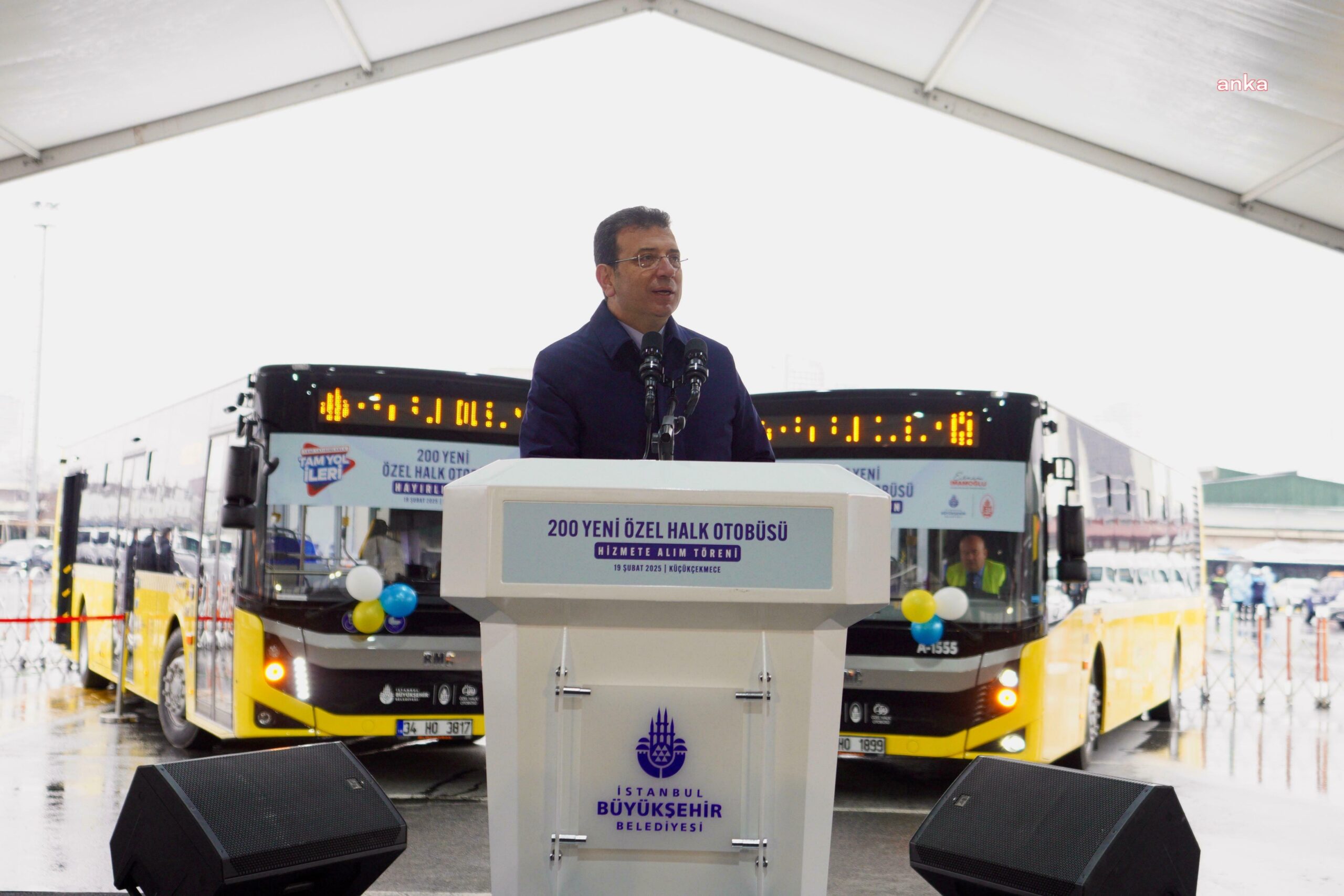200 Yeni Özel Halk Otobüsü Hizmete Alım Töreni, TBB ve İBB Başkanı Ekrem İmamoğlu’nun katılımıyla, İETT İkitelli Garajaı’nda düzenlendi. Kar yağışı altında yapılan törende, Özel Halk Otobüsleri Odası Başkanı Göksel Ovacık, İETT Genel Müdürü İrfan Demet, Küçükçekmece Belediye Başkanı Kemal Çebi ve İmamoğlu birer konuşma yaptı. İstanbul’un, benzeri nüfusa sahip dünya kentlerindeki metro hatlarının yarısı kadar kilometreye sahip olduğu bilgisini paylaşan İmamoğlu, “Toplu taşımanın konforlu hale gelmesinin tek yöntemi, hele hele bir de her bir biçimde büyümüş bir İstanbul’un, bu kadar uzun bir satha uzamış bir İstanbul’un en önemli hattının raylı sistemleri olduğunun altını çiziyorum. Bunu şundan söylüyorum: Bugün aslında otobüslerimize çok ağır bir yük yüklenmekte. Bu yükün hafifleyerek daha az bir yüke evrilmesi ve o sistem içerisinde de çok kaliteli bir yolculuğun orada sağlanmasına ulaşmamız şart” dedi.