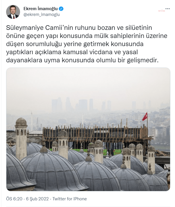 “Süleymaniye Camii’nin ruhunu bozan ve silüetinin önüne geçen yapı konusunda mülk sahiplerinin üzerine düşen sorumluluğu yerine getirmek konusunda yaptıkları açıklama kamusal vicdana ve yasal dayanaklara uyma konusunda olumlu bir gelişmedir.