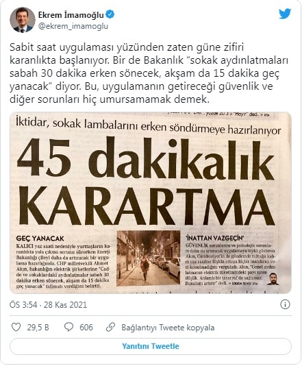 “Sabit saat uygulaması yüzünden zaten güne zifiri karanlıkta başlanıyor” diyen İmamoğlu, “Bir de Bakanlık ‘sokak aydınlatmaları sabah 30 dakika erken sönecek, akşam da 15 dakika geç yanacak’ diyor. Bu, uygulamanın getireceği güvenlik ve diğer sorunları hiç umursamamak demek” dedi.