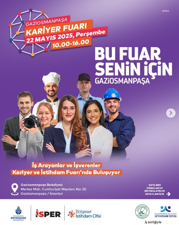 22 Mayıs tarihinde Gaziosmanpaşa Belediyesi’nde, 14 özel sektör firmasının katılımı ile geçekleşecek Kariyer ve İstihdam Fuarı’nda iş arayanlar hem işverenler ile yüz yüze görüşme imkanı bulacak hem de Bölgesel İstihdam Ofisi’nin CV Hazırlama ve Mülakat Teknikleri Eğitimi ile Enstitü İstanbul İSMEK’in Etkili Konuşma ve Stres Yönetimi eğitimlerine ücretsiz olarak katılabilecek.