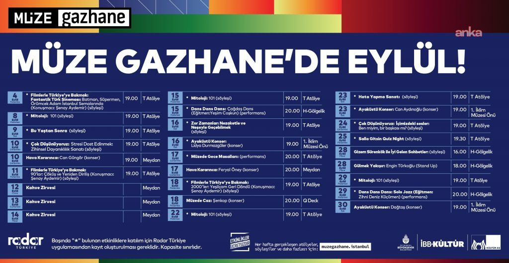 Şehrin en canlı kültür ve sanat duraklarından Müze Gazhane, eylül ayında da ilham veren etkinlikleriyle İstanbulluları buluşturmaya devam ediyor. İBB Kültür A.Ş. tarafından düzenlenen programlar; konserlerden sergilere, atölyelerden söyleşilere uzanan geniş yelpazesiyle her yaştan ziyaretçiye renkli bir deneyim sunacak.