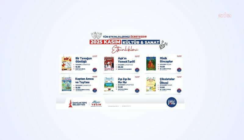 “Aşk’ın Yemek Tarifi”, 8 Kasım Cumartesi günü saat 20.00’de Emek Kültür Merkezi’nde; “Kaptan Amca ve Tayfası”, 9 Kasım Pazar günü saat 12.00’de Mevlana Kültür Merkezi’nde; “Minik Sincaplar,” 16 Kasım Pazar günü saat 12.00’de Yenidoğan Kültür Merkezi’nde; “Zıp Zıp ile Mır Mır”, 22 Kasım Cumartesi günü saat 12.00’de Yenidoğan Kültür Merkezi’nde ve “Çikolatalar Ülkesi” 23 Kasım Pazar günü saat 12.00’de Samandıra Kültür Merkezi’nde ücretsiz olarak sahnelenecek.